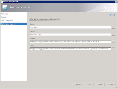 - On the following screen, you'll need to select the values to collect and how the labels should show up when looking for them in the performance monitors. You want the "Object" to be LogicalDisk, this way you can search the datawarehouse for logicaldisk counters and it will show up in the same grouping. This will also allow the value to show up in the same group as your other Logical Disk performance counters elsewhere in the system. You want to give the "Counter" value a name, such as "Total Disk Space" or "Total Disk Size" something to identify this counter as representing the size of the partition in question.